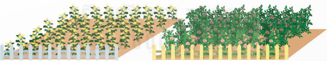 Trường Tiểu học Hòa Bình có hai mảnh vườn trồng hoa. Mảnh vườn trồng hoa hồng dạng hình chữ nhật có chiều dài 14 m, chiều rộng 10 m. Mảnh vườn trồng hoa cúc dạng hình vuông có cạnh 12 m.