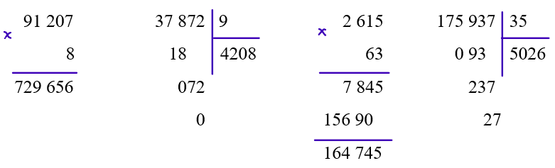 | 605 x 13 = 7 865 | 163 x 7 = 1 141 |