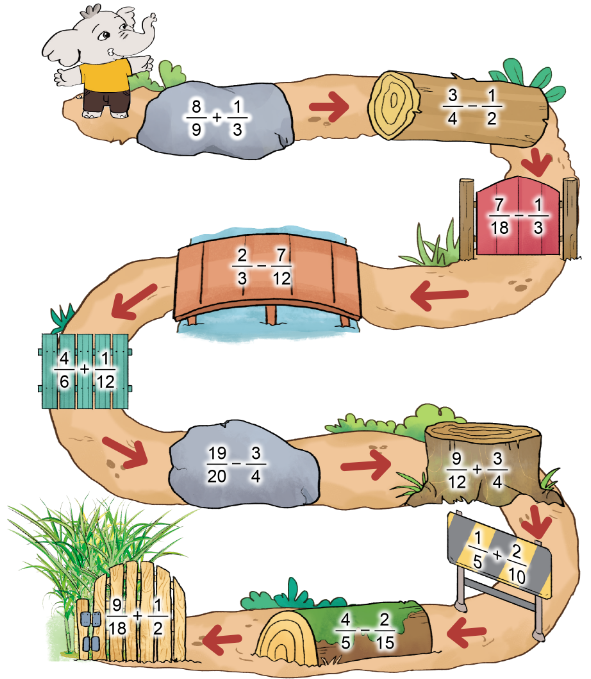 Hãy giúp bạn Voi tìm được vườn mía bằng cách thực hiện đúng các phép cộng, phép trừ hai phân số trên đường đi.