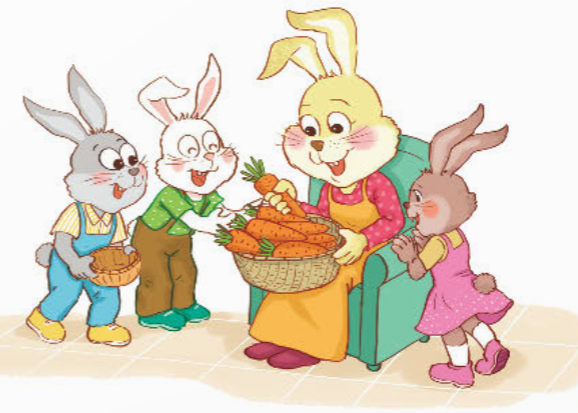 Thỏ mẹ chia một giỏ cà rốt cho các con. Thỏ nâu được