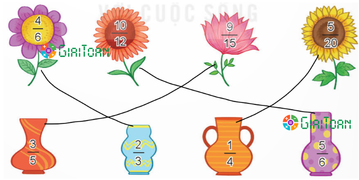 Rút gọn mỗi phân số ghi ở bông hoa được phân số nào ghi ở lọ hoa?