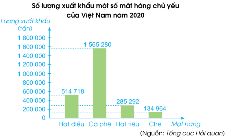 b) Mặt hàng Việt Nam xuất khẩu nhiều nhất trong năm 2020 là cà phê (1 565 280 tấn).