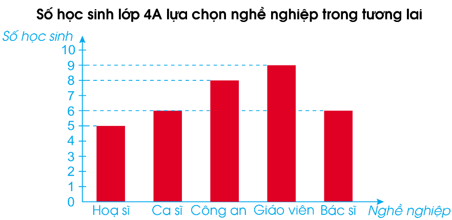 a) Những nghề nghiệp được các bạn học sinh lớp 4A lựa chọn là: Hoạ sĩ; ca sĩ; công an; giáo viên; bác sĩ