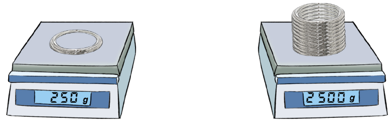Cuộn dây thép dài 5 m thì cân nặng 250 g. Hỏi cuộn dây thép cùng loại đó cân nặng 2 500 g thì dài bao nhiêu mét?