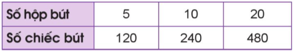 a) Nêu nhận xét về quan hệ phụ thuộc giữa số chiếc bút và số hộp bút.