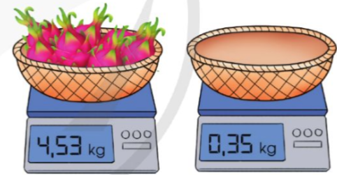 Rổ thanh long cân nặng 4,53 kg, biết rằng chiếc rổ khi không có thanh long cân nặng 0,35 kg. Tính cân nặng của các quả thanh long có trong rổ.