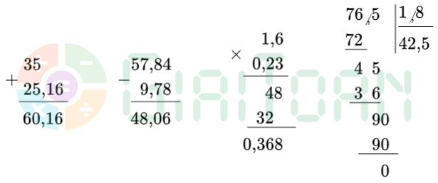 35 + 25,16 57,84 - 9,78 | 1,6 x 0,23 76,5 : 1,8 |