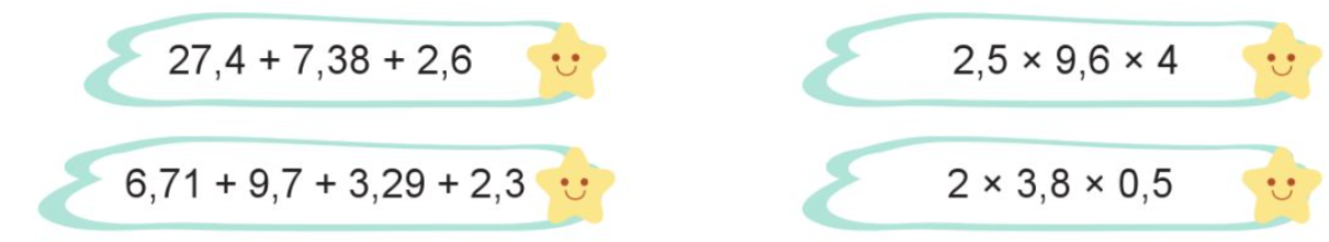 d) 27,4 + 7,38 + 2,6 = (27,4 + 2,6) + 7,38 = 30 + 7,38 = 37,38 | 2,5 x 9,6 x 4 = (2,5 x 4) x 9,6 = 10 x 9,6 = 96 |