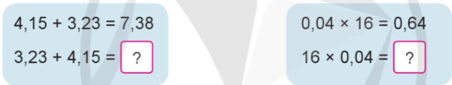 4,15 + 3,23 = 7,38 3,23 + 4,15 = 7,38 | 0,04 x 16 = 0,64 16 x 0,04 = 0,64 |