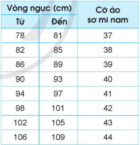 Vòng ngực của bố bạn Nguyên là 99,3 cm. Theo em, bố bạn Nguyên nên chọn cỡ áo sơ mi nào?