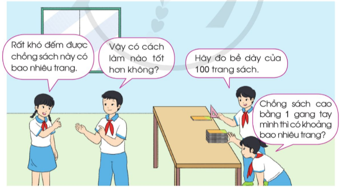 Đo bề dày 100 trang sách theo đơn vị mi-li-mét. Dựa vào số đo đó, ước lượng xem nếu xếp các trang sách như thế cao khoảng 1 gang tay của em thì cần bao nhiêu trang sách.