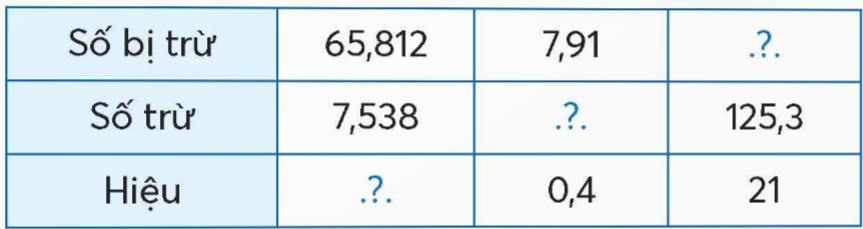 | Số bị trừ | 65,812 | 7,91 | 146,3 |
