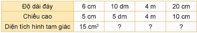 Diện tích hình tam giác | 15 cm2 | 25 dm2 | 8 m2 | 100 cm2 |