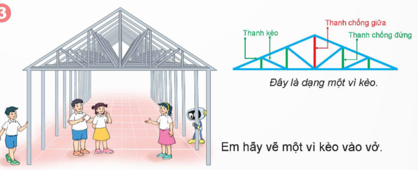 Trong bức tranh bên, em hãy tìm các hình tam giác và cho biết mỗi hình tam giác đó có dạng hình tam giác gì.