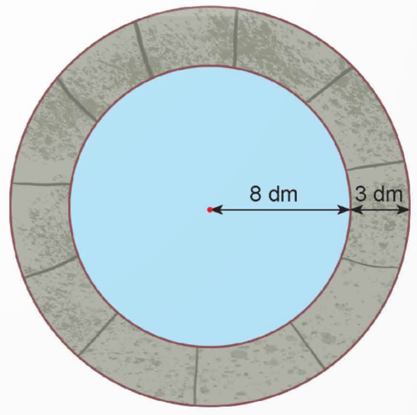 Một giếng nước có miệng giếng là một hình tròn bán kính 8 dm. Người ta xây thành giếng trên phần đất rộng 3 dm bao quanh miệng giếng (như hình dưới đây). Tính diện tích phần đất xây thành giếng đó.