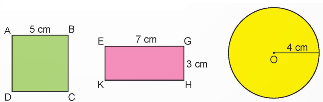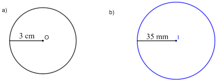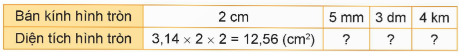 | Bán kính hình tròn | 2 cm | 5 mm | 3 dm | 4 km |
