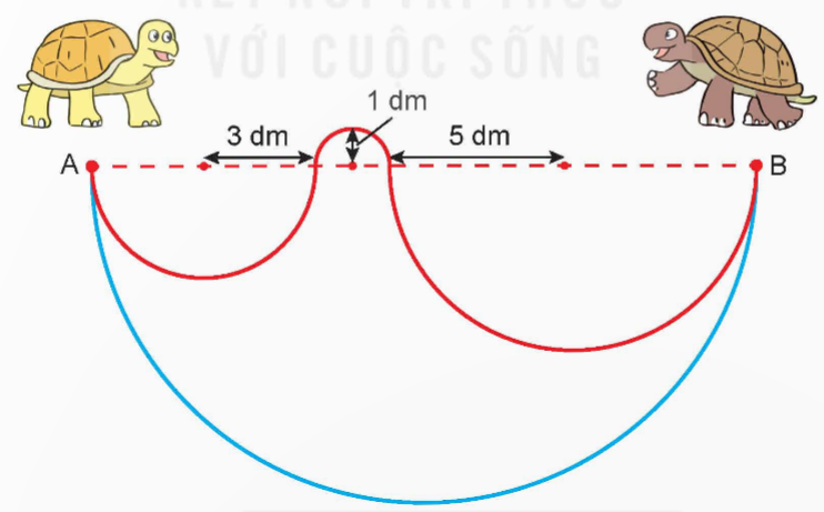 Chú rùa màu vàng bò từ A đến B theo đường màu đỏ, chú rùa màu nâu bò từ B đến A theo đường màu xanh (như hình vẽ). Hỏi chú rùa nào bò quãng đường dài hơn?