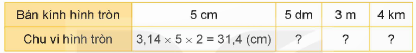 | Bán kính hình tròn | 5 cm | 5 dm | 3 m | 4 km |