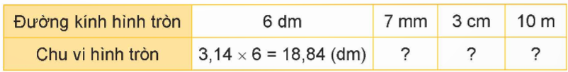 | Chu vi hình tròn | 3,14 x 6 = 18,84 (dm) | 3,14 x 7 = 21,98 (mm) | 3,14 x 3 = 9,42 (cm) | 3,14 x 10 = 31,4 (m) |