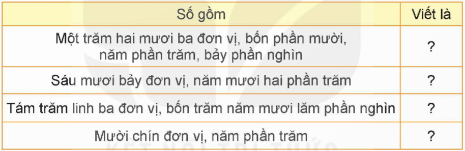 Một trăm hai mươi ba đơn vị, bốn phần mười, năm phần trăm, bảy phần nghìn | 123,457 |