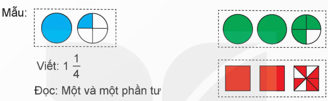 a) Viết rồi đọc hỗn số chỉ phần đã tô màu của mỗi hình dưới đây (theo mẫu).