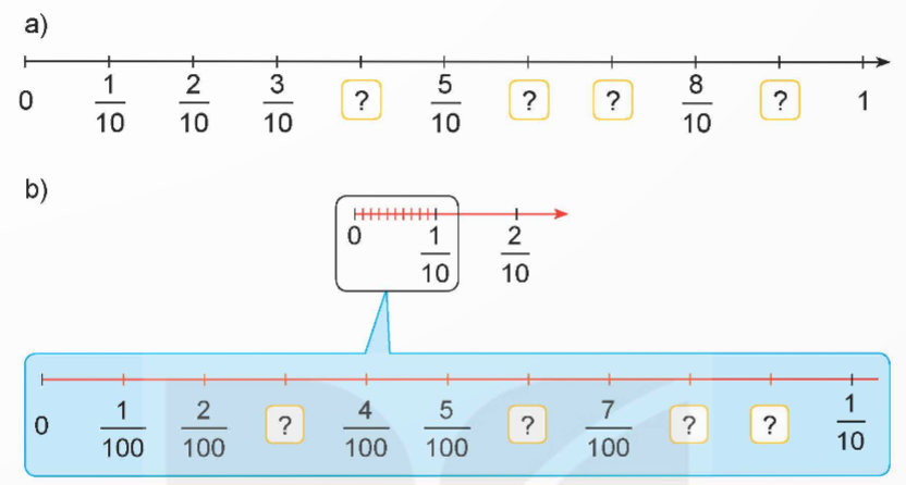 a) Các phân số thập phân thích hợp theo thứ tự từ trái qua phải là: